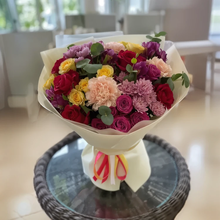 Нежные лепестки искрятся живыми красками, образуя завораживающий микс кустовых и одноголовых хризантем великолепной палитры. В сочетании с роскошными кустовыми розами, это букет переплетает элегантность и яркость. Изящно упакованный в элегантную крафтовую упаковку, он готов подарить незабываемые эмоции и запечатлеть восхищение в сердцах ваших близких.