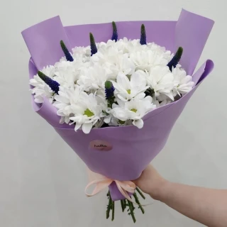 Этот эксклюзивный букет из белых хризантем, словно облака, окутанный лунным светом, идеально сочетается с изысканным декором. Упакованный в элегантную обертку, он символизирует чистоту и невинность. Каждая хризантема тщательно подобрана, создавая впечатление воздушности и легкости. Идеален для торжественных моментов или как выражение искренних чувств.