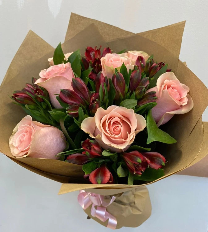 Нежные одноголовые розы и альстромерии, расцветают, словно луна наступающего дня. Оттенки создают гармонию и нежность, отражая чистоту и надежду. Каждый цветок уютно сплетен с другим, символизируя взаимопонимание и близость. Идеальная элегантная упаковка подчеркивает изысканность и красоту этого букета, который станет прекрасным подарком для самых близких и дорогих людей в особенные моменты жизни.